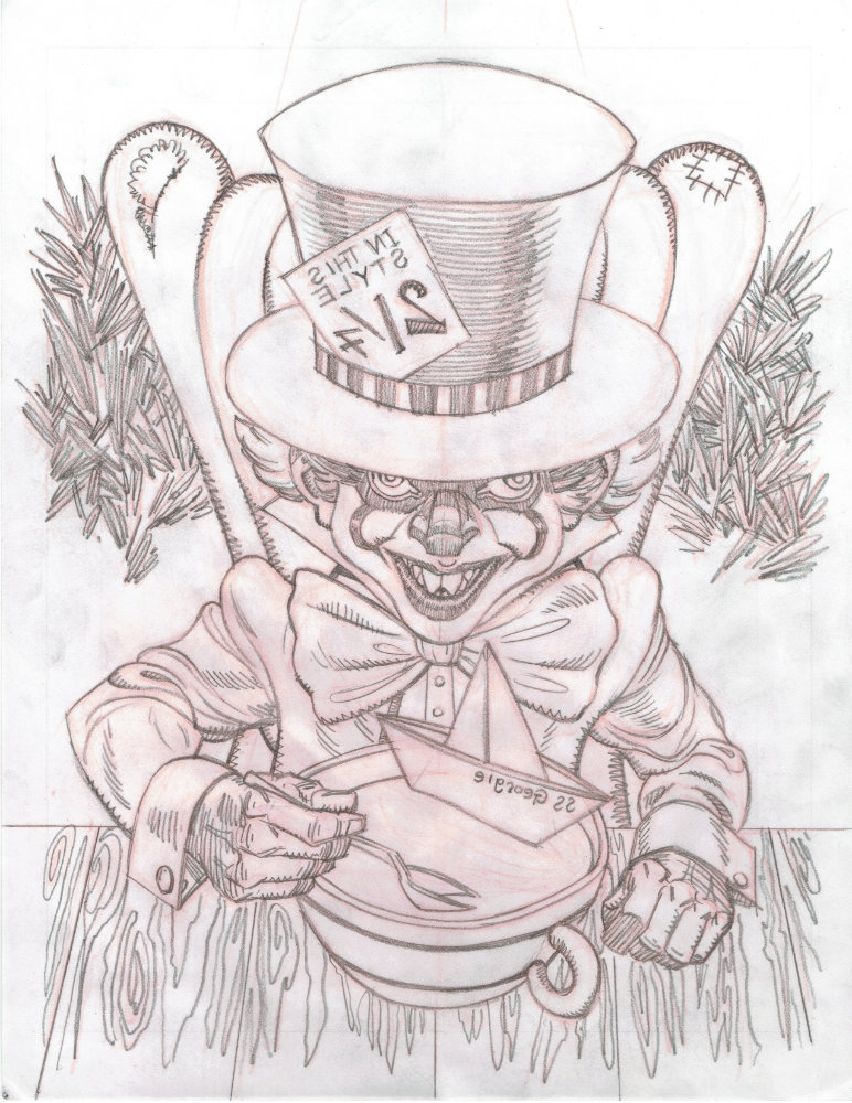Preliminary sketch for one-of-five Alice in Wonderland-inspired images of infused with elements of horror author Stephen King.