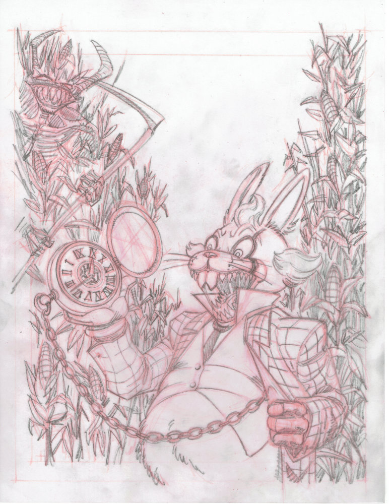Preliminary sketch for one-of-five Alice in Wonderland-inspired images of infused with elements of horror author Stephen King.