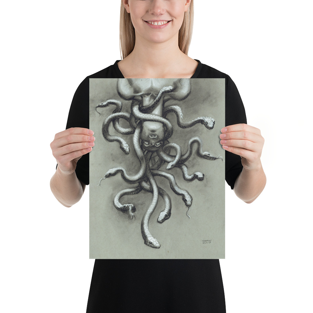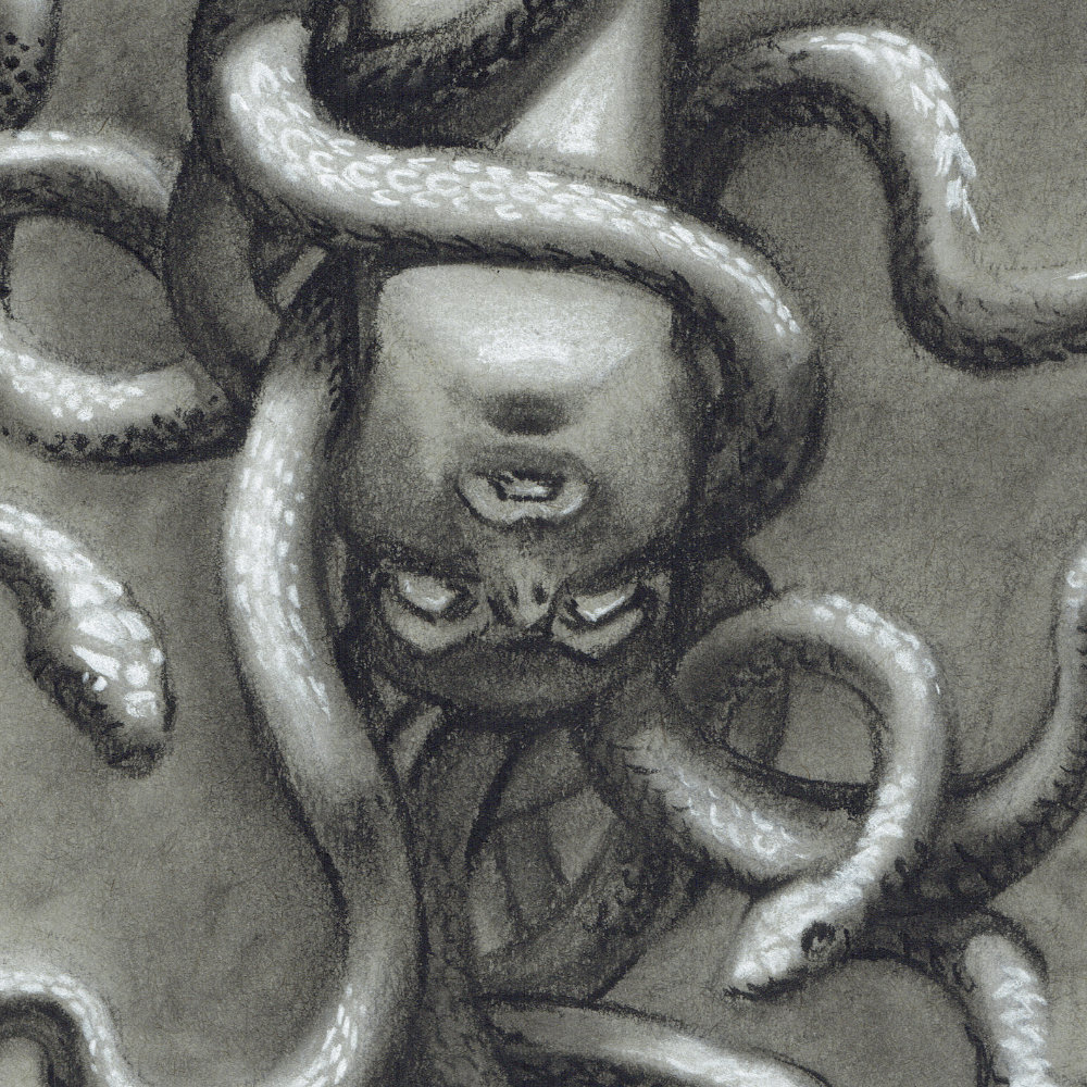 Her scaled locks hiss. Above she waits, still as stone. Don't look up.