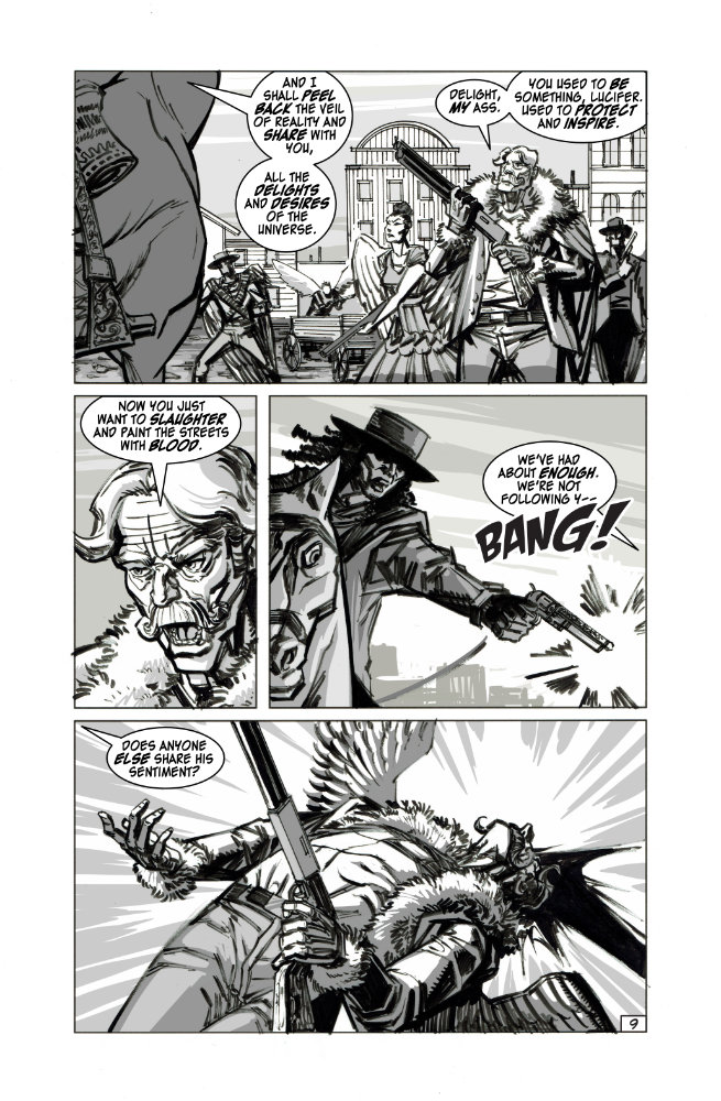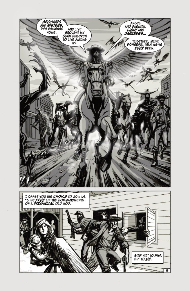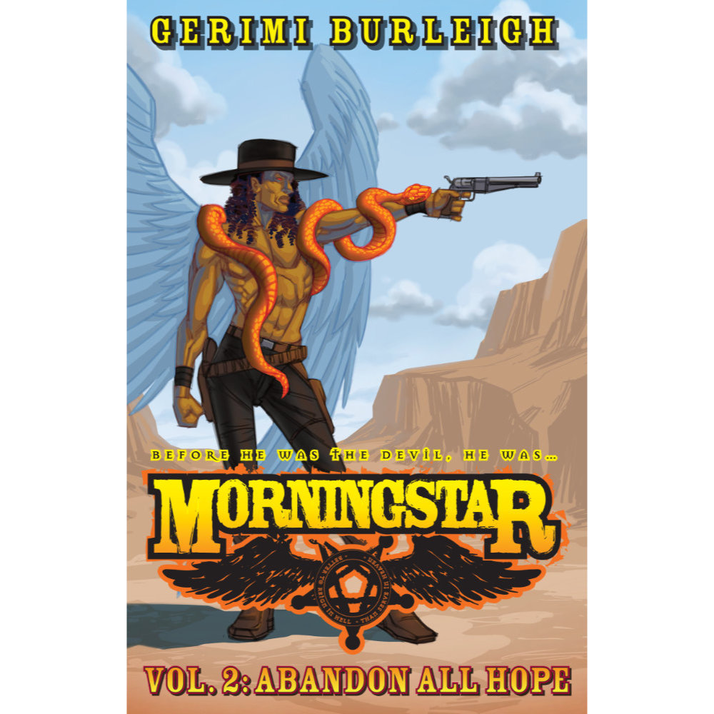 In the Beginning, one cowboy attempted to rule creation… Lucifer Morningstar, once the Marshal of Heaven, reveals a deeper shadowy nature and turns down a path of betrayal and rebellion against God, his fellow Archangels, and Heaven itself. This graphic novel collects the final comic book issues of the series (#5-8), plus bonus material. By Gerimi Burleigh, writer/artist of the psychological thriller, EYE OF THE GODS.